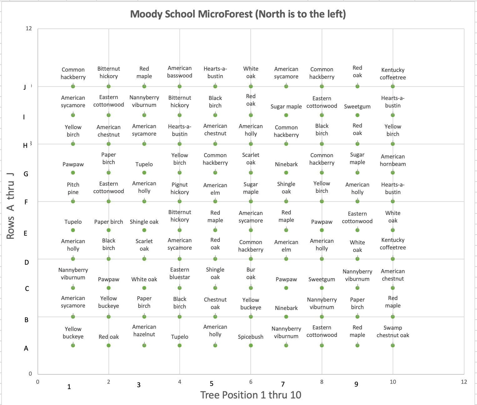 “The microforest is small - only about 50’ x 50’. Its 100 trees & shrubs, representing over 30 native species, are planted 5 feet on center, in a square 10-tree by 10-tree grid pattern. The pattern will look artificial at first, but it allows keeping track of the individual trees more easily than if they were planted in a random pattern.”