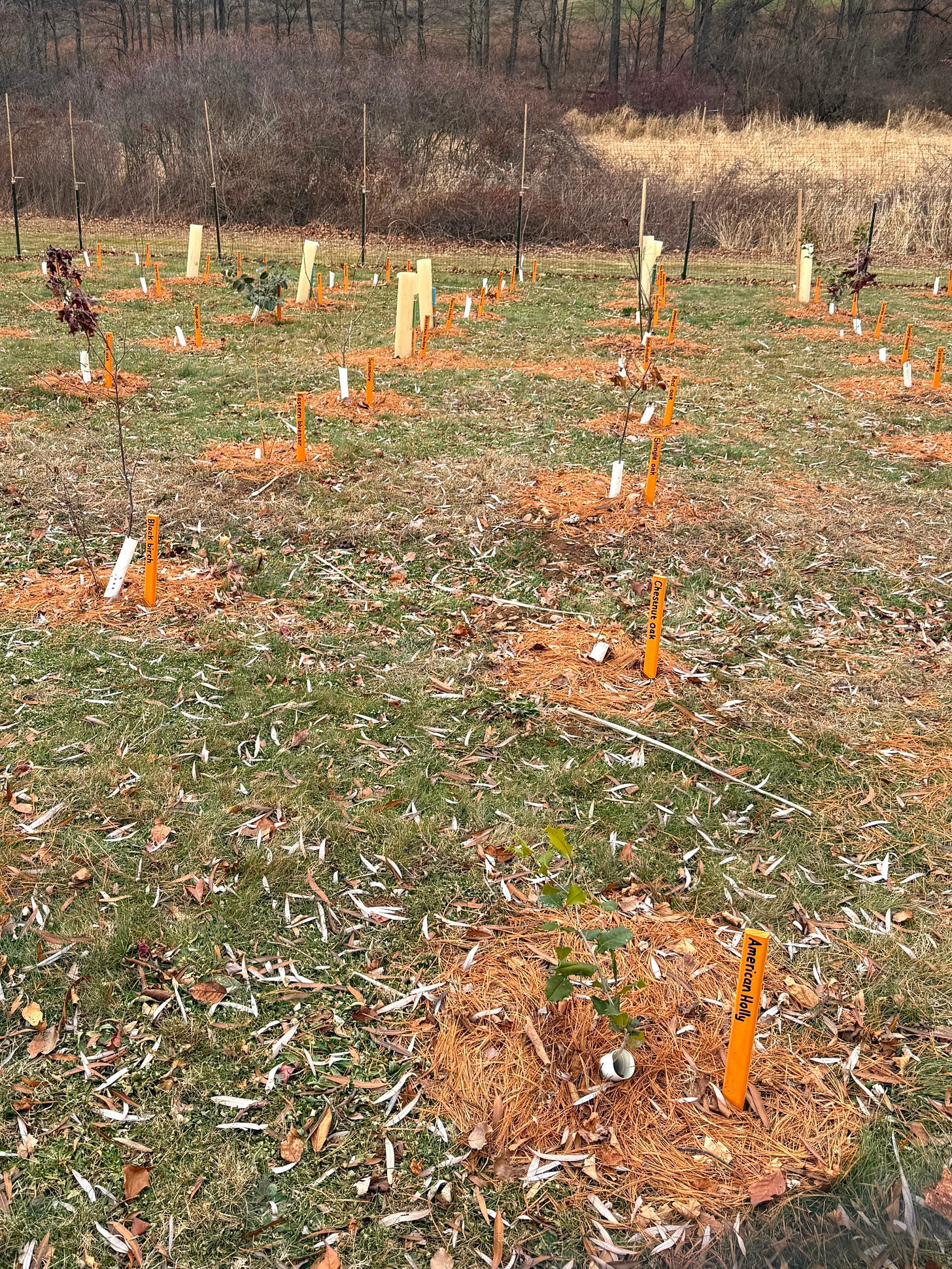 The 6-foot deer fence came up over my head – relatively short but a substantial deterrent. The labeled saplings, mostly dormant twigs, were protected with a white casing around the tree base with a ground layer of pine mulch. “I hope it will still dissuade deer because there is such a small area inside the fence, and there are other woodlands to browse on nearby,” Steve adds.